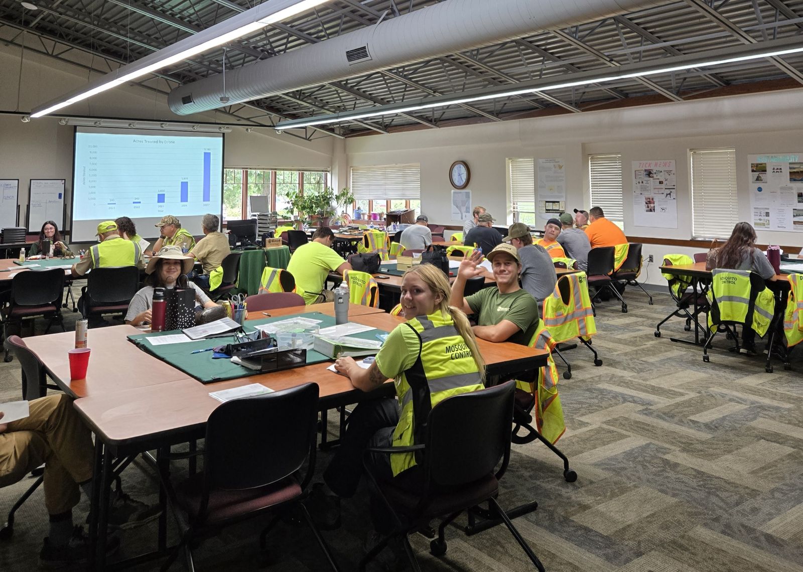The thing we enjoy the most about this job is that you get to do something new every day! Our daily shift is 6:30 am – 3 pm. A day on the job will consist of a meeting with your Field Operations Supervisor and a crew of 7-8 other Technicians and then going into the field to do a wide array of mosquito control either independently or with others. Daily tasks include larval inspections and treatments in wetlands, adult inspections and treatments, and disease vector prevention. We also have opportunities to do more tasks to gain experience if interested. We hire a wide range of ages from college students to retirees. Come join our facility, we’d love to have you!